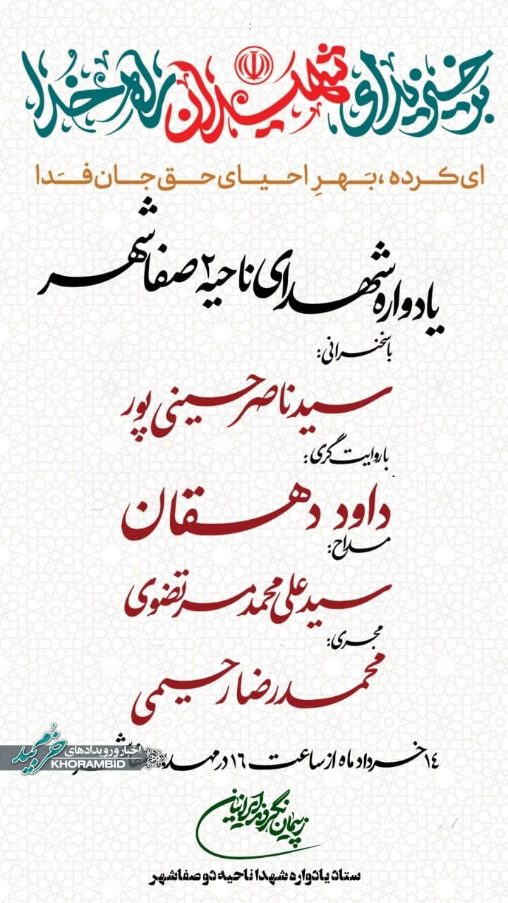 به گزارش خرم بید، سیوپنجمین یادواره شهدای ناحیه ۲ صفاشهر، همزمان با سیوششمین سالگرد ارتحال ملکوتی حضرت امام خمینی (ره)، روز ۱۴ خردادماه با حضور پرشور اقشار مختلف مردم، خانوادههای معظم شهدا و ایثارگران، مسئولان محلی و جمعی از نیروهای نظامی و انتظامی در مهدیه صفاشهر برگزار گردید.