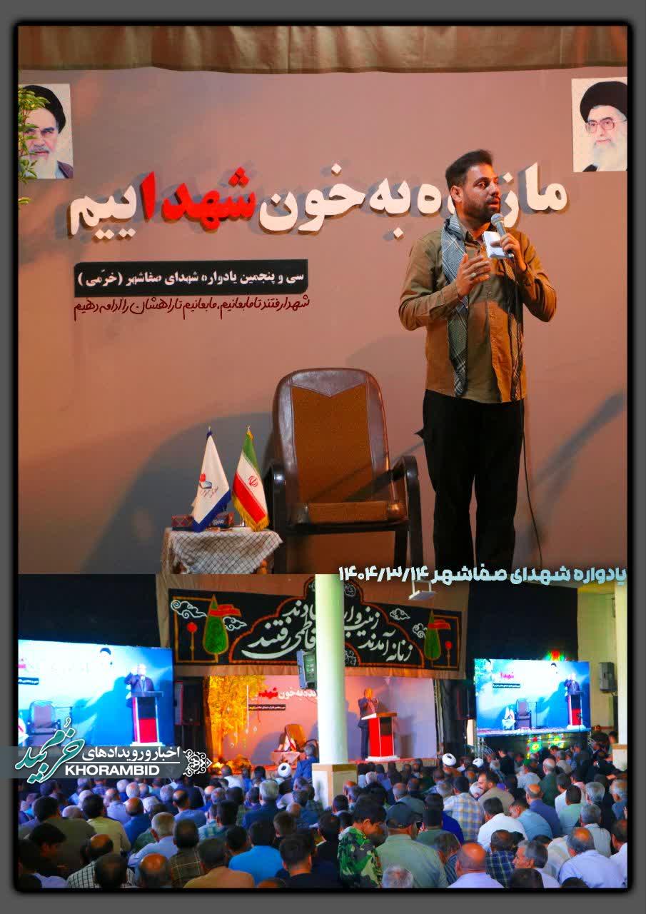 همچنین حجتالاسلام والمسلمین دهقان، امام جمعه شهرستان خرمبید، در سخنانی با اشاره به نقش مهم شهدا در حفظ عزت و امنیت کشور، بر لزوم تبیین سیره شهدا برای نسل جوان تأکید نمود.