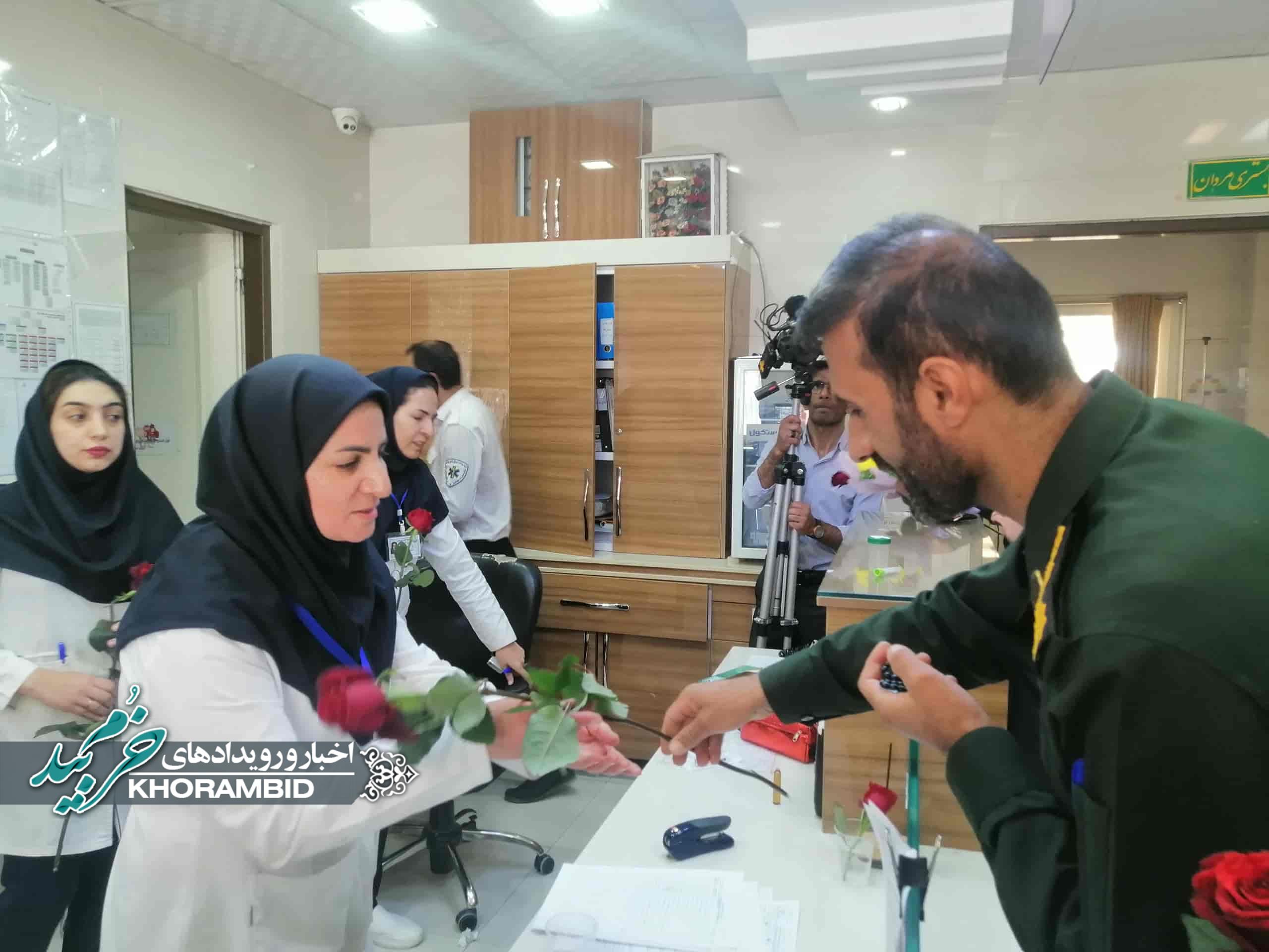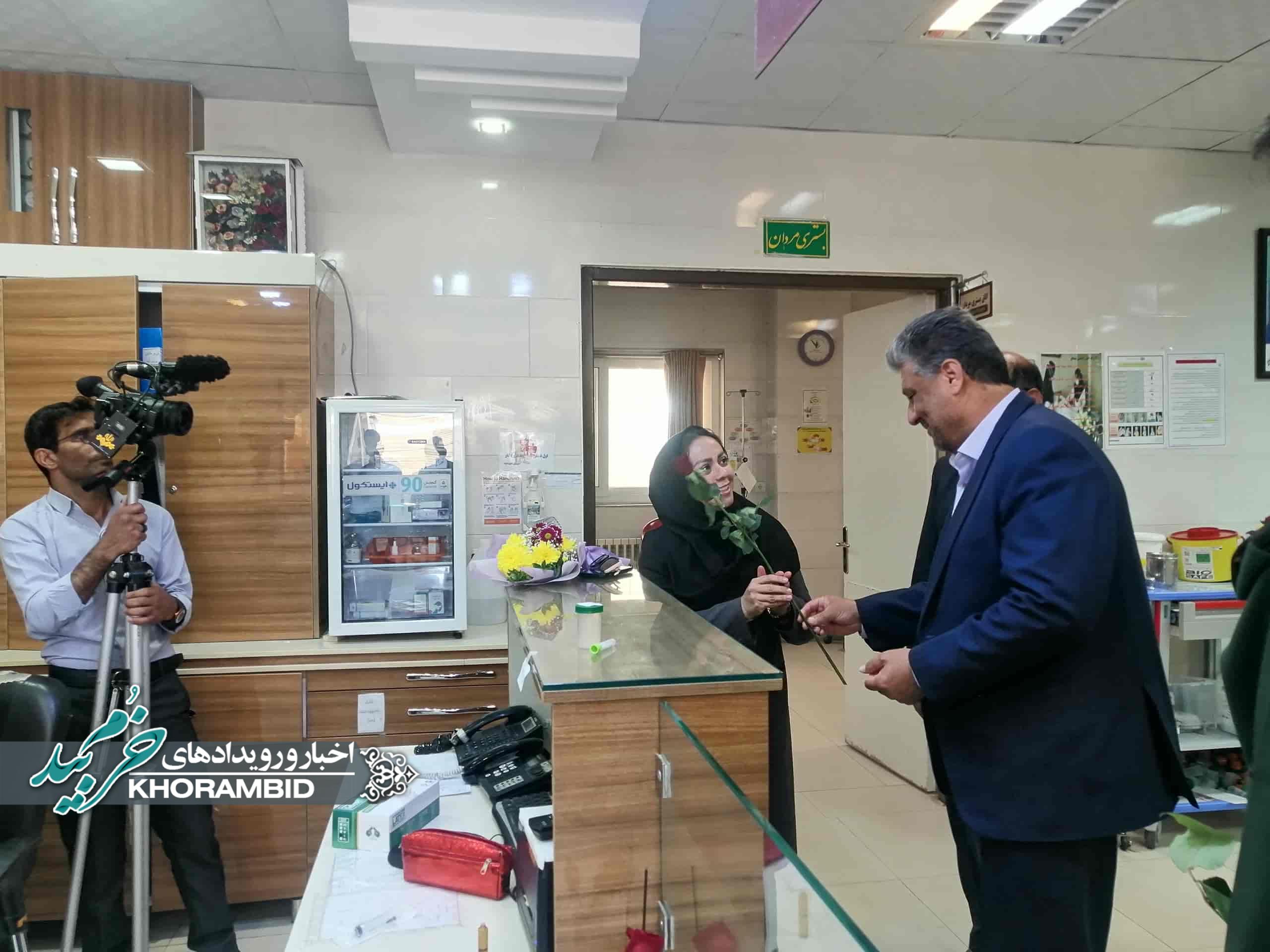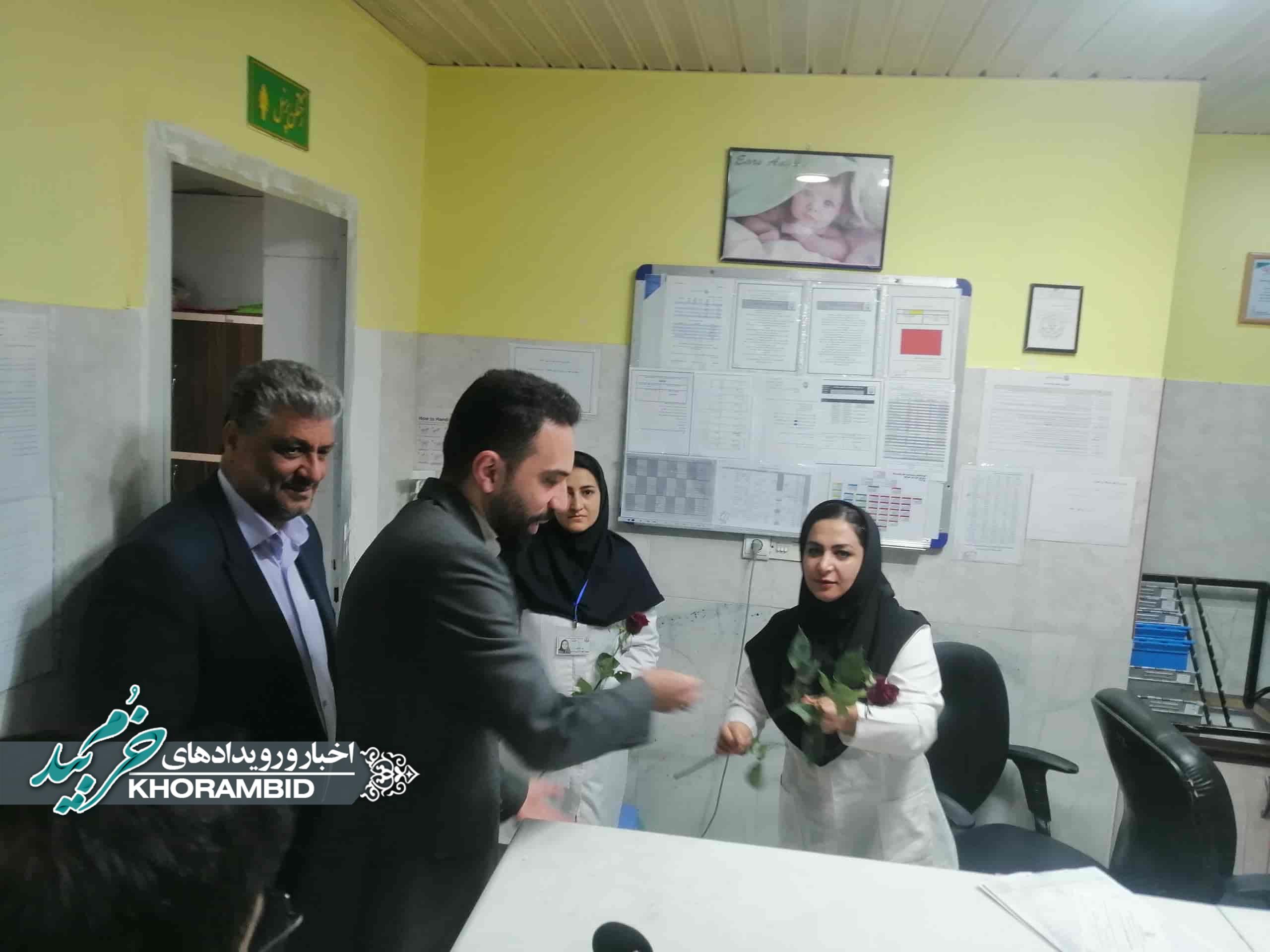 در ادامه، از پرستاران بیمارستان حضرت ولیعصر(عج) شهرستان خرمبید توسط فرماندار شهرستان و مسئولین همراه، با اهدای گل، تجلیل به عمل آمد.