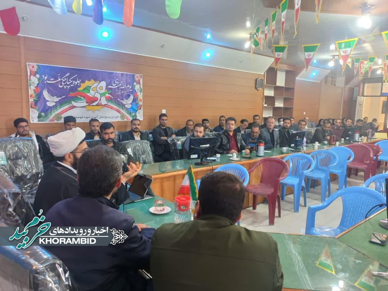 به گزارش خرم بید به نقل از روابط عمومی مدیریت آموزش و پرورش،همزمان با دهه بصیرت و هفته مقاومت کارگاه تخصصی شیوههای تربیتی تعامل با دانش آموزان با محوریت مسائل سیاسی اجتماعی و شرایط روز کشور با حضور حجت الاسلام والمسلمین مجتهدزاده از شهر مقدس قم در سالن اجتماعات سردار سلیمانی مدیریت آموزش و پرورش خرم بید برگزار شد.